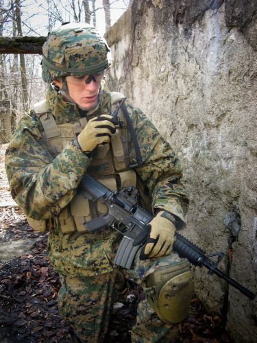 Jakna in hlače v omenjenem vzorcu (original USMC), zaščitne rokavice (firma mechanix CB ali blackhawk v CB/OD barvi) in CB ščitniki za kolena.